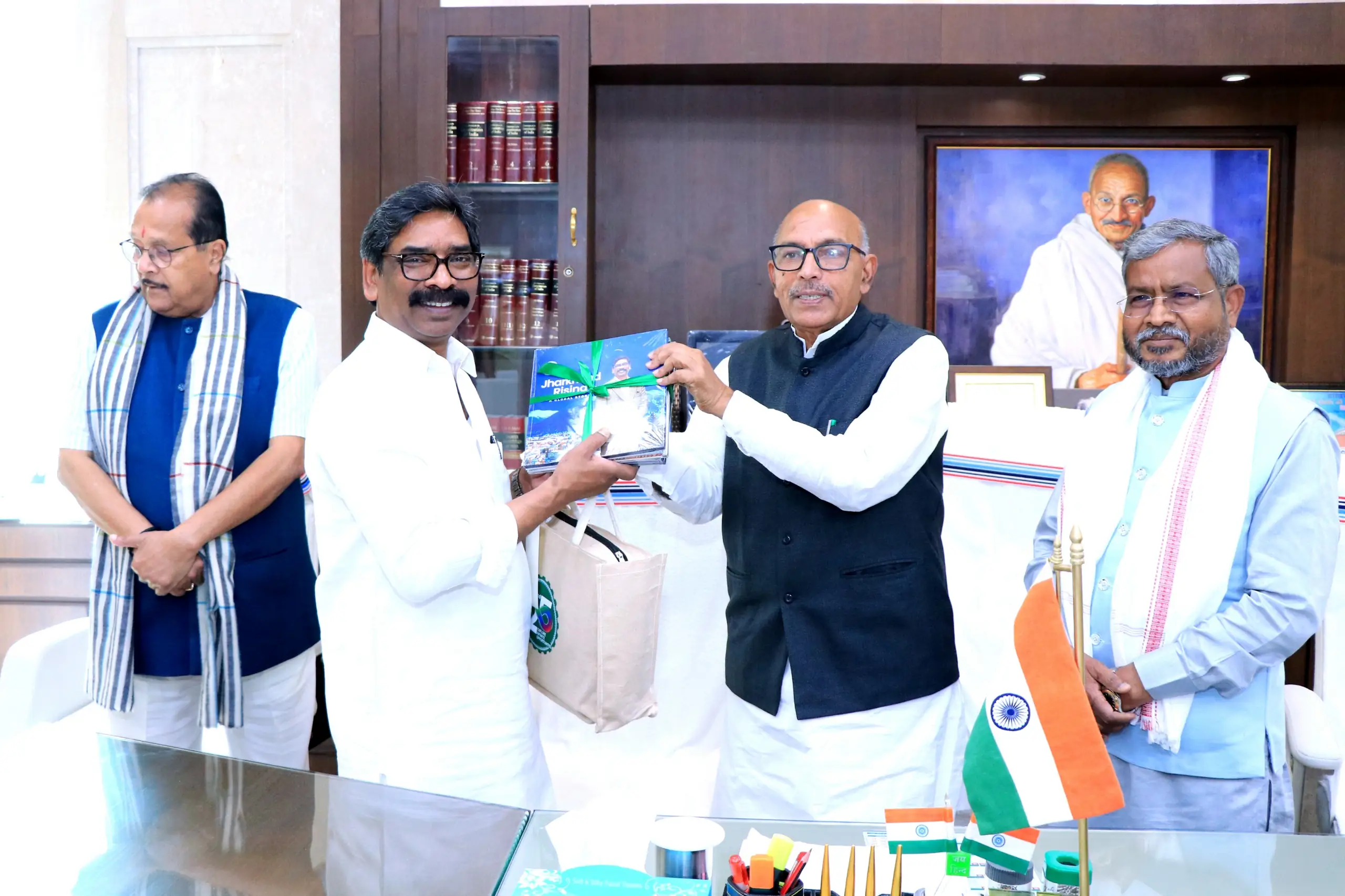 Ranchi, Honorable Chief Minister Mr. Hemant Soren paid a courtesy call on Honorable Jharkhand Assembly Speaker Mr. Rabindra Nath Mahto at the Jharkhand Ministry today. On this occasion, the Honorable Chief Minister presented the book “JHARKHAND RISING A GLOBAL STORY” and a coffee table book published by the state government to the Honorable Assembly Speaker with best wishes. The book “JHARKHAND RISING A GLOBAL STORY” contains a detailed report of the visit of an 11-member delegation led by Chief Minister Mr. Hemant Soren to Davos and the United Kingdom (London) in the previous January month by the state government, and the coffee table book contains comprehensive information about the developmental works done by the state government. On this occasion, the Honorable Chief Minister Mr. Hemant Soren presented the book “JHARKHAND RISING A GLOBAL STORY” and a coffee table book with best wishes to the Honorable Parliamentary Affairs Minister Mr. Radha Krishna Kishore and the Honorable Leader of the Opposition Mr. Babulal Marandi.